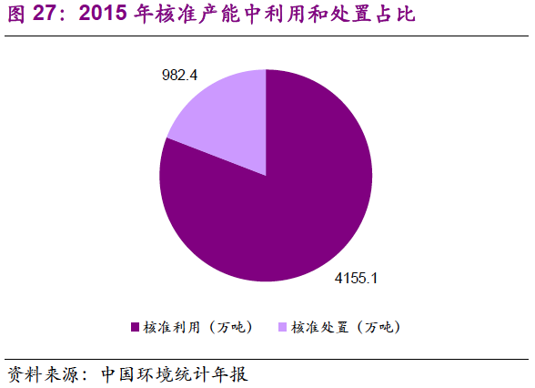 2015年,國(guó)家開(kāi)始推行“三去、一降、一補(bǔ)”,主要行業(yè)固定資產(chǎn)總規(guī)模呈現(xiàn)下降趨勢(shì),這也是供給側(cè)改革背景下的必然趨勢(shì),而這種趨勢(shì)預(yù)計(jì)至少會(huì)延續(xù)到2020年。危廢的產(chǎn)生又與行業(yè)規(guī)模及工業(yè)產(chǎn)品產(chǎn)量有關(guān),因此我們有理由推斷,如果暫不考慮“存量”即隱性需求釋放和統(tǒng)計(jì)缺陷,危廢“增量”的實(shí)際增速是有限的。