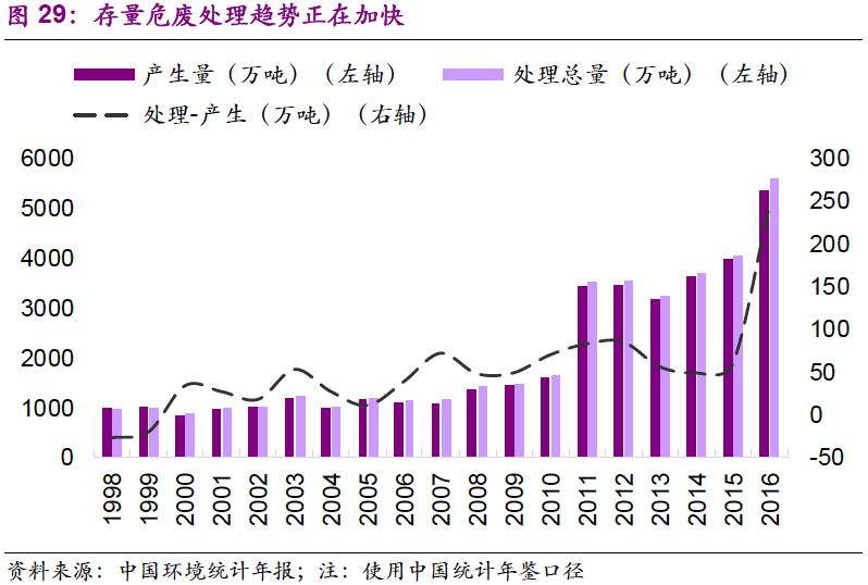 1. 存量危廢處理趨勢(shì)正在加快。2016年,以處理總量減去當(dāng)年產(chǎn)生量計(jì)算處置往年貯存量,得出處置往年貯存量超過(guò)240萬(wàn)噸,是2015年的4倍。由于環(huán)保壓力加強(qiáng),大量超期貯存危廢得到處置。同時(shí)環(huán)保督察中許多歷史遺留暴露,導(dǎo)致處置量大于產(chǎn)生量,存量消滅趨勢(shì)明顯。作為“歷史欠賬”,存量危廢入市是必然趨勢(shì)。然而考慮到危廢種類,占存量絕大多數(shù)的危廢并不會(huì)直接流向危廢處置企業(yè)。參考存量鉻渣的處理,未來(lái)很有可能以專項(xiàng)整治的方式進(jìn)行解決。