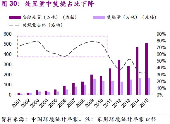 3.處置量中焚燒占比下降,其波動(dòng)中樞由2001-2010年的70%降至2011-2015年的40%。原因在于危廢行業(yè)市場(chǎng)化運(yùn)作加強(qiáng),處置方式呈多元化發(fā)展。自2004年發(fā)改委《關(guān)于實(shí)行危險(xiǎn)廢物處置收費(fèi)制度促進(jìn)危險(xiǎn)廢物處置產(chǎn)業(yè)化的通知》出臺(tái),危廢行業(yè)市場(chǎng)化趨勢(shì)明顯。相比傳統(tǒng)的焚燒、填埋,物化、水泥窯協(xié)同等手段逐漸拓展市場(chǎng)空間。《中國(guó)環(huán)境統(tǒng)計(jì)年報(bào)》顯示,2012年后,焚燒+填埋所處置的危廢量占比逐年下降,2015年已降至50%。另一方面,當(dāng)前以焚燒為代表的無(wú)害化產(chǎn)能稀缺,我們認(rèn)為短期內(nèi)“補(bǔ)短板”效應(yīng)為主要因素。從長(zhǎng)期來(lái)看,隨著循環(huán)經(jīng)濟(jì)的不斷推動(dòng),處置會(huì)趨于精細(xì)化,各種處置方式將均衡發(fā)展。