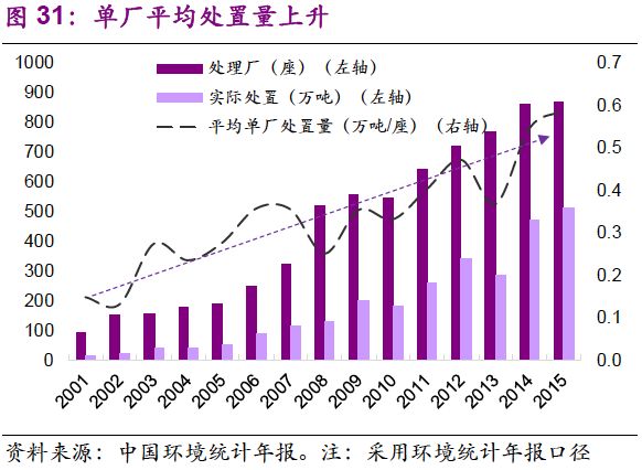 2. 單廠處置量上升,平均規(guī)模由2001年的0.15萬(wàn)噸/座提升至2015年的0.6萬(wàn)噸/座。開(kāi)始階段,危廢處置小型企業(yè)居多,處理方式粗獷、簡(jiǎn)單。隨著標(biāo)準(zhǔn)趨嚴(yán),設(shè)備和技術(shù)的提高,單廠處置量大的企業(yè)具備規(guī)模效應(yīng)。當(dāng)前,危廢行業(yè)景氣度的提高,已引起資本市場(chǎng)關(guān)注,如雅居樂(lè)、東方園林、中信產(chǎn)業(yè)基金等跨界者強(qiáng)勢(shì)進(jìn)入,并通過(guò)行業(yè)兼并等方式逐漸規(guī)?;?/p>