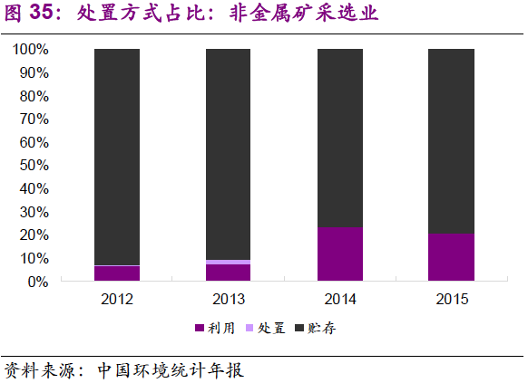 5. 在主要產(chǎn)廢行業(yè)中,危廢的利用和處置占比變化不大?;瘜W(xué)原料和化學(xué)制品制造業(yè):2012-2015年,行業(yè)危廢綜合利用率在62%~64%之間窄幅振動(dòng),處置率為32%~35%;有色金屬冶煉和壓延加工業(yè):2012-2015年,行業(yè)危廢綜合利用率在56%~63%之間窄幅振動(dòng),處置率為11%~20%;非金屬礦采選業(yè):2012-2015年,行業(yè)危廢貯存率小幅下降,由2012年的93%降至2015年的79%,利用率由7%提升至21%,主要是石棉廢物的綜合利用取得進(jìn)展。造紙和紙制品業(yè):行業(yè)危廢綜合利用率較高,且小幅上升,至2015年已達(dá)97%。