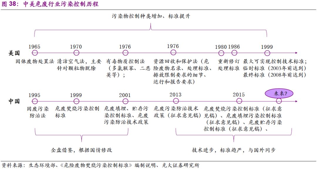 以危廢焚燒為例,美國(guó)對(duì)煙氣污染物控制種類逐步增加,標(biāo)準(zhǔn)逐步提高。從1970年《清潔空氣法》(針對(duì)顆粒物脫除),到1976年《有毒物質(zhì)控制法》(針對(duì)多氯聯(lián)苯、二惡英等),再到1999最大可實(shí)現(xiàn)控制技術(shù)標(biāo)準(zhǔn)??梢?jiàn),隨著人們對(duì)污染物認(rèn)識(shí)的提升,控制種類不斷豐富;隨著技術(shù)進(jìn)步,排放標(biāo)準(zhǔn)逐步趨嚴(yán)。
