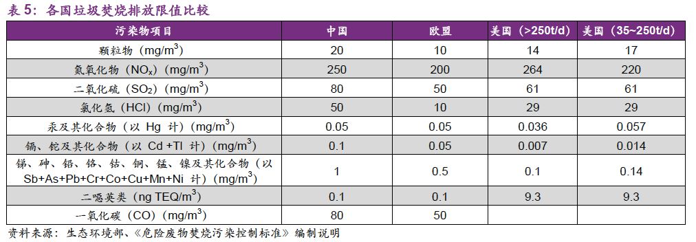 征求意見(jiàn)稿對(duì)污染物排放標(biāo)準(zhǔn)做了大幅提高。首先取消了對(duì)不同焚燒容量的排放限值差別,實(shí)行統(tǒng)一管理。其次,對(duì)煙塵、二氧化硫(SO2)、氟化氫(HF)、氯化氫(HCl)、氮氧化物(以NO2計(jì))等排放限值都進(jìn)行了更高標(biāo)準(zhǔn)。其中二噁英的排放限值修改為0.1TEQng/m3,實(shí)現(xiàn)與國(guó)際接軌。
