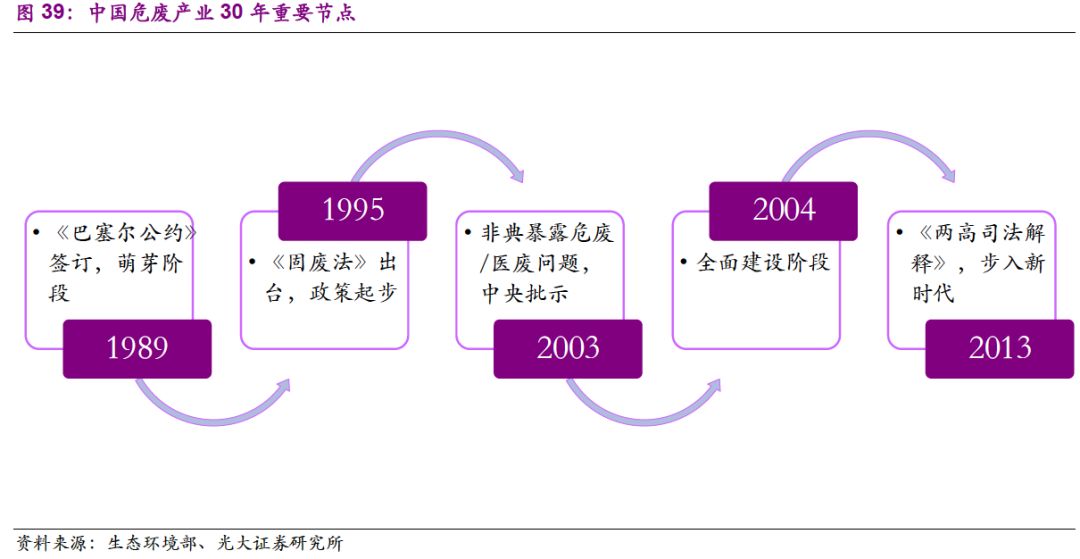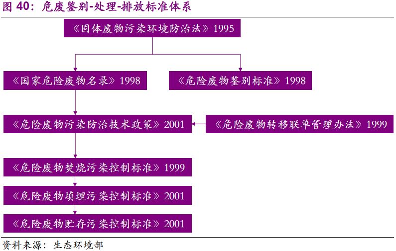 1995年《固廢法》的出臺(tái),標(biāo)志著我國(guó)危廢行業(yè)的起步。《固體廢物污染環(huán)境防治法》首次從法律層面涉及危廢管理,同時(shí)提及經(jīng)營(yíng)許可證、危險(xiǎn)廢物轉(zhuǎn)移聯(lián)單、國(guó)家危險(xiǎn)廢物名錄,而三者落地的時(shí)間分別為2004、1999和1998年。從1995-2002年,我國(guó)基本建立起危廢處理處置從鑒別-處理-排放的標(biāo)準(zhǔn)體系。