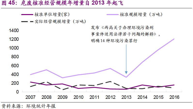 2016年12月,最高人民法院、最高人民檢察院再次發(fā)布關(guān)于辦理環(huán)境污染刑事案件適用法律若干問(wèn)題的解釋,對(duì)違法傾倒、無(wú)證經(jīng)營(yíng)危險(xiǎn)廢物行為進(jìn)行從重處罰,再次推高危廢行業(yè)熱度。
