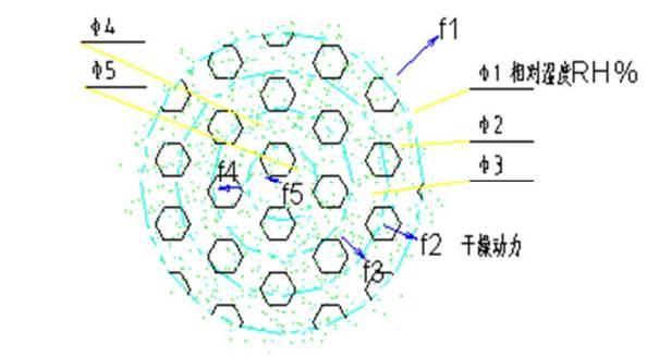 干燥動力(f1~f5):就是物料中水份(或溶液)向物料外部的遷移(蒸發(fā))的能力。其處決于物料與相鄰物體的蒸汽分壓或相對濕度(RH)的差值,差值越大,其移動或轉(zhuǎn)移的能力就越大。物體內(nèi)階梯型的相對濕度(φ1~φ5)逐漸增加,在φ1很小φ5很大時,階梯的相對濕度(RH)的差值更趨明顯,水分遷移能力就很大。而當φ1接近φ5時, 階梯的相對濕度(RH)的差值減少,水分遷移能力(蒸發(fā)強度)就很小。這就是同等條件下,干燥設備內(nèi)物料水分較小時,蒸發(fā)強度低的原因。