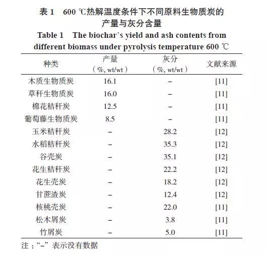 同樣的熱解溫度條件下,不同的炭化材料制備的生物質(zhì)炭性質(zhì)不同。600 ℃條件制備的木質(zhì)生物質(zhì)炭、草稈生物質(zhì)炭、棉花秸稈生物質(zhì)炭和葡萄藤生物質(zhì)炭產(chǎn)量相比,木質(zhì)生物質(zhì)炭和草稈生物質(zhì)炭的產(chǎn)量16.1%(wt/wt)較高,而葡萄藤生物質(zhì)炭的產(chǎn)量8.5%(wt/wt)較低(表1)。生物質(zhì)炭的產(chǎn)量指風(fēng)干生物質(zhì)熱解炭化后的干重,主要與生物質(zhì)中的纖維素和木質(zhì)素含量有關(guān)。同樣的溫度條件下,不同來源生物質(zhì)炭的灰分含量變化較大,秸稈類生物質(zhì)炭的灰分含量較高22.2%~35.1%(wt/wt),而木炭和竹炭的灰分含量較低3.8%~5.0% (wt/wt)。一般來說,木本科的生物質(zhì)炭含碳量較高,礦質(zhì)養(yǎng)分較少;畜禽糞便和草本植物生產(chǎn)的生物質(zhì)炭含碳量較低,礦質(zhì)元素含量較高。