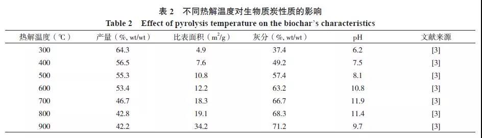 一般來說在熱解過程中隨著溫度的升高,生物質(zhì)炭的產(chǎn)量會逐漸降低、生物質(zhì)炭的比表面積和孔隙結(jié)構(gòu)會變得更加豐富。已有研究表明,污泥生物質(zhì)炭的產(chǎn)量由300 ℃時的64.3%(wt/wt)下降到900 ℃時的 42.2%(wt/wt);而比表面積由300 ℃時的4.9 m2/g 增加到900 ℃時的34.2 m2/g (表2)。生物質(zhì)炭表面的-COOH、-COH 和-OH 等含氧官能團逐漸增多,由此產(chǎn)生的表面負電荷使得生物質(zhì)炭具有較高的陽離子交換量(CEC)。熱解溫度越高,生物質(zhì)炭的pH 越高,這是由于熱解過程中會產(chǎn)生大量灰分,其中的礦質(zhì)元素溶于水后呈堿性所致。