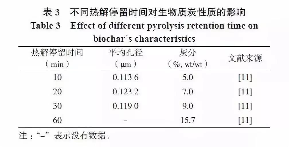生物質(zhì)炭具有復(fù)雜的孔隙結(jié)構(gòu),其孔徑大小決定其比表面積。而生物質(zhì)炭的孔徑大小與熱解停留時間也有關(guān)系。當熱解停留時間為20~30 min 時,生物質(zhì)炭的平均孔徑相對于停留時間10 min 時的孔徑尺寸提高了4.8%~8.5%(表3)。灰分含量也會隨著熱解停留時間的延長而增加。Tan 等分析結(jié)果表明熱解停留時間為20 min,生物質(zhì)炭的灰分含量為7.0% ;停留時間為60 min,其灰分含量增加至15.7%。這是由于熱解停留時間長,易于有機物質(zhì)揮發(fā)而殘留更多的灰分。