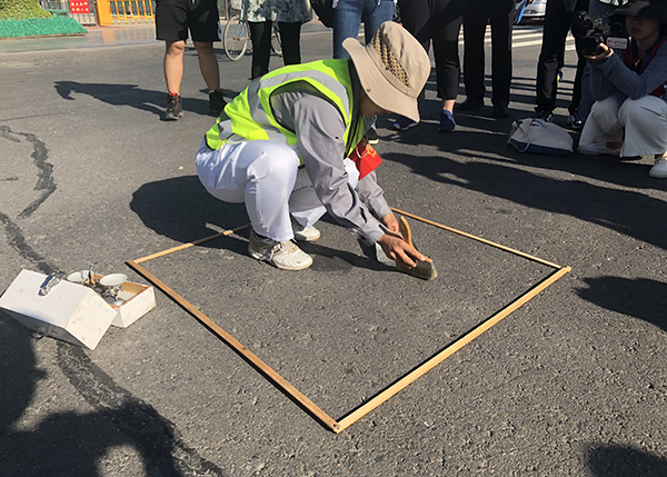 衛(wèi)生監(jiān)管檢測(cè)員姬學(xué)鑫在收集道路浮沉。光明網(wǎng)王麗媛/攝