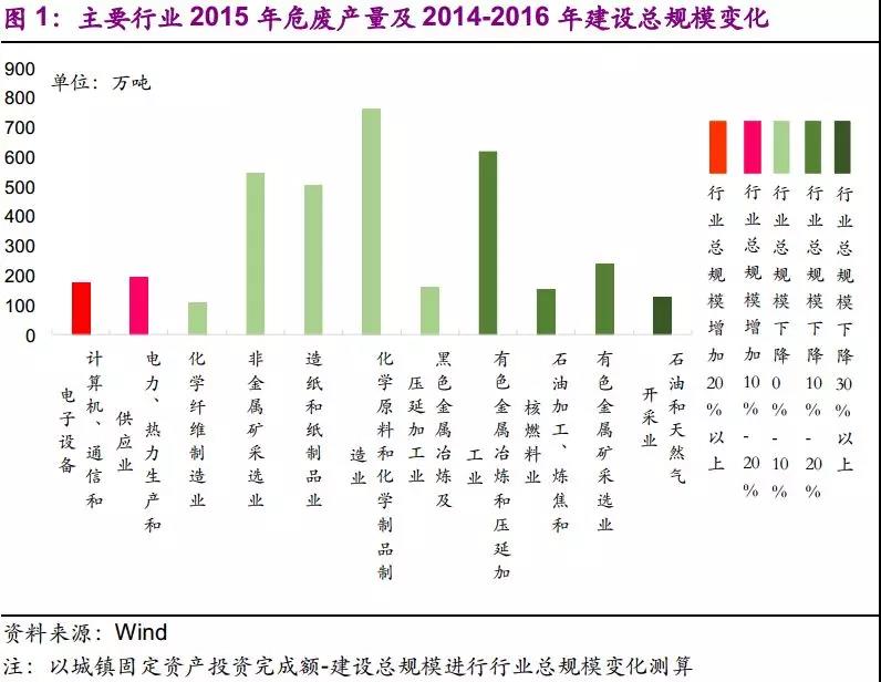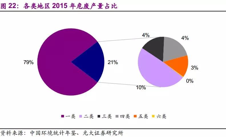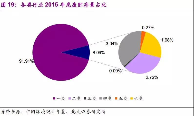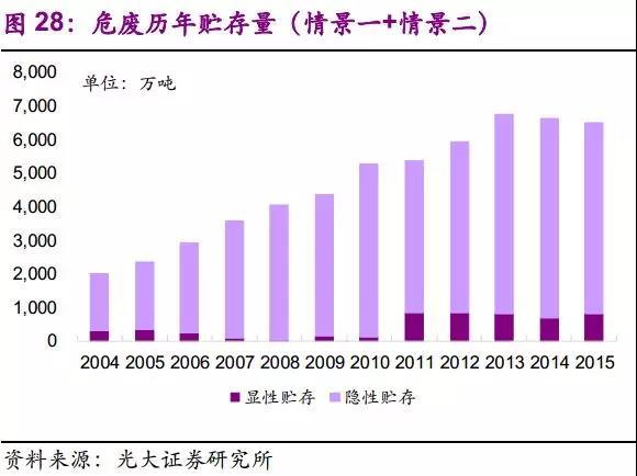 ◆增量部分:自上而下,從工業(yè)增加值的角度:產(chǎn)廢強(qiáng)度不變的情況下,危廢每年新增1.1億噸;若考慮到工藝進(jìn)步引起的危廢產(chǎn)生強(qiáng)度下降,在樂觀、中觀、悲觀三種預(yù)期下,2017年實(shí)際工業(yè)危廢產(chǎn)量分別為6706、7546和8666萬噸。自下而上,從產(chǎn)污系數(shù)的角度:我們根據(jù)現(xiàn)有最新數(shù)據(jù)及不完全統(tǒng)計(jì), 2016年,化學(xué)原料和化學(xué)制品制造業(yè)和有色金屬冶煉和壓延加工業(yè)分別為1141.6和1082.2萬噸。2015年,兩個(gè)行業(yè)危廢產(chǎn)量占總產(chǎn)量比例為34.8%,假設(shè)其比例變化不大,則全國危廢總產(chǎn)量為6390萬噸。