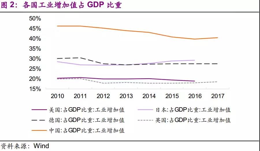 工業(yè)增加值占GDP比重仍有下降空間。2010年以來,我國工業(yè)增加值占GDP比重逐年下降,但整體仍在40%左右水平。從國際視角來看,發(fā)達(dá)國家在20%-30%的水平,這與國際產(chǎn)業(yè)分工、不同經(jīng)濟(jì)發(fā)展階段側(cè)重點(diǎn)有關(guān)。當(dāng)前,我國正處在產(chǎn)業(yè)升級(jí)及轉(zhuǎn)型的重要時(shí)期,第三產(chǎn)業(yè)也逐步成為拉動(dòng)經(jīng)濟(jì)增長(zhǎng)的重要引擎之一,預(yù)計(jì)我國工業(yè)結(jié)構(gòu)將進(jìn)一步優(yōu)化,工業(yè)增加值占GDP比例也有望進(jìn)一步下降。