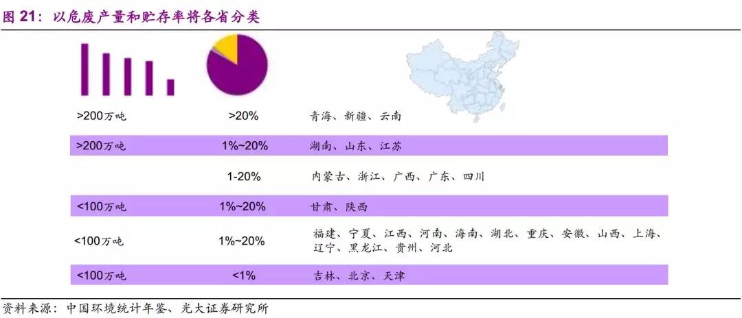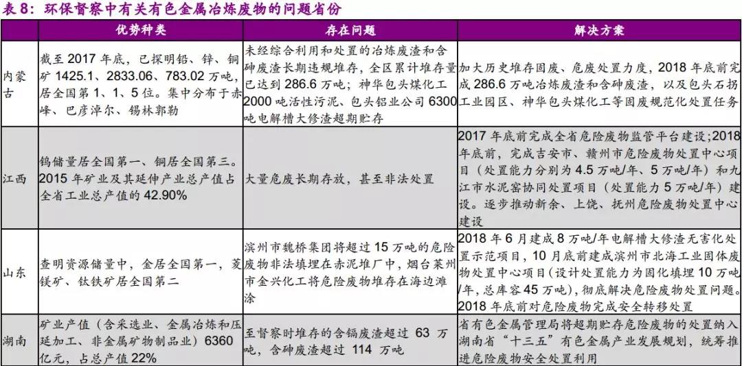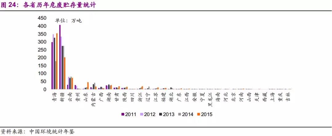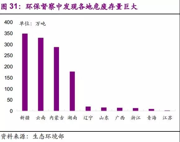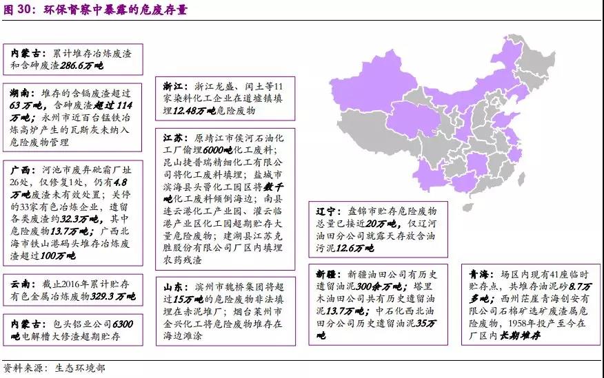 ◆存量部分:自上而下,歷史累積、自然消減和官方統(tǒng)計(jì)量差別三因素模型:假設(shè)年消減系數(shù)γ為0.7、0.8、0.9,則2004-2015年累計(jì)貯存總量分別為6847.9、13584.4、27201.3萬噸。應(yīng)關(guān)注的省份:青海、新疆、云南;應(yīng)關(guān)注的行業(yè):非金屬礦采選業(yè)、有色金屬礦采選業(yè)、有色金屬冶煉及壓延加工業(yè);應(yīng)關(guān)注的危廢種類:石棉廢物、無機(jī)氰化物、有色金屬冶煉廢物等。自下而上,環(huán)保督察角度:危廢存量在“環(huán)保督察”中已大量暴露:在新疆、青海、云南等地,發(fā)現(xiàn)數(shù)百萬噸的石棉、冶煉廢渣以及油泥,驗(yàn)證了我們前文提到的需關(guān)注行業(yè)和省份。