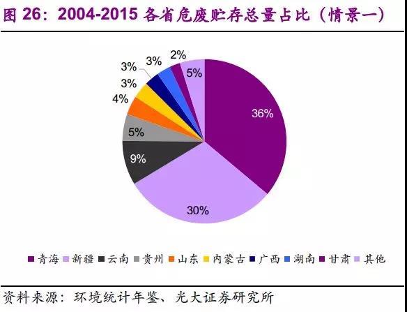 不考慮危廢官方統(tǒng)計(jì)量與實(shí)際產(chǎn)量的產(chǎn)別和危廢的自然消減,即將每年官方公布的貯存量簡(jiǎn)單加和,即得到危廢總貯存量?;谇榫耙坏募僭O(shè),青海、新疆成為危廢貯存絕對(duì)大省,占全國危廢貯存量的66%。