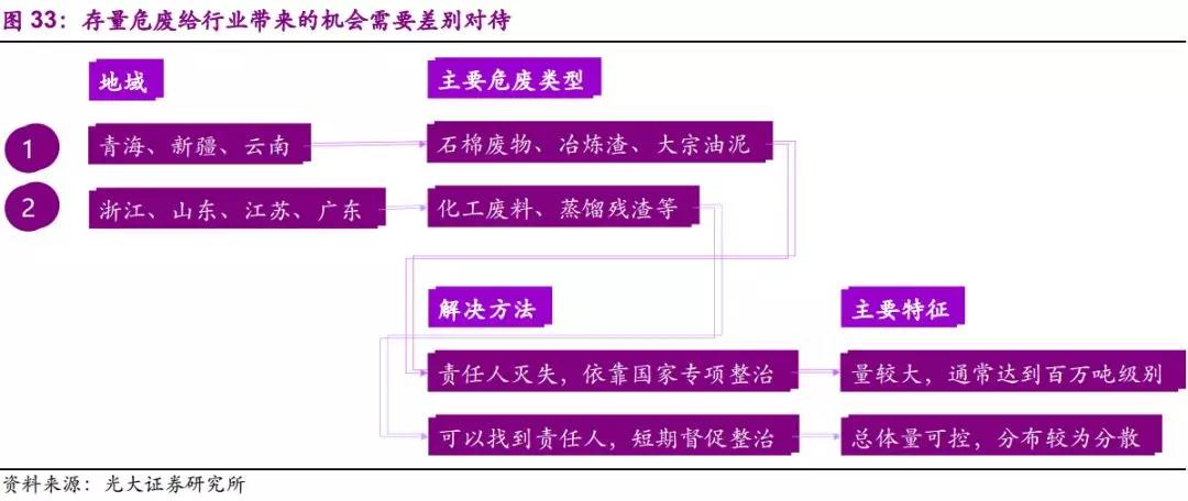 4. 對(duì)增量市場(chǎng)和存量市場(chǎng)帶來的機(jī)會(huì),進(jìn)行積極而有區(qū)別的對(duì)待。我們認(rèn)為,增量市場(chǎng)中顯性需求在2017-2019年增速為30%、20%、20%,并于2019年達(dá)到峰值;而存量市場(chǎng)應(yīng)密切關(guān)注各地歷史遺留問題的解決方案和推進(jìn)進(jìn)度。四種典型歷史遺留危廢的治理進(jìn)度為:油泥>無機(jī)氰化物>有色金屬冶煉廢物>石棉廢物。