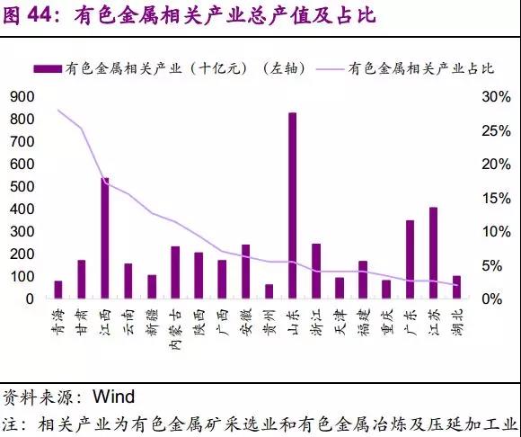 針對(duì)本次環(huán)保督察中有色金屬冶煉廢物存量較大的省份,我們發(fā)現(xiàn)兩大特點(diǎn)。1)有色金屬相關(guān)產(chǎn)業(yè)總產(chǎn)值占工業(yè)總產(chǎn)值比重較大。如甘肅、江西、青海、云南等地,占比均在10%以上。2)單位產(chǎn)量有色金屬產(chǎn)生工業(yè)總產(chǎn)值較低。如內(nèi)蒙古、貴州、甘肅、云南、青海、新疆,每噸總產(chǎn)值均低于7萬元。