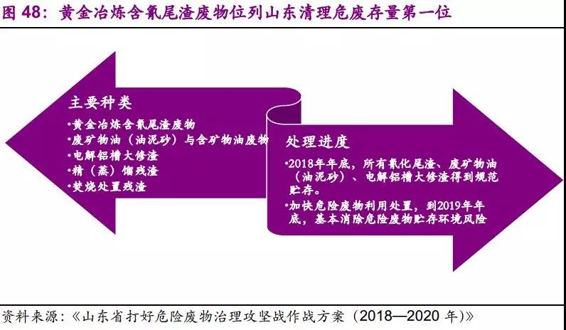 無機(jī)氰化物存量清理已拉開序幕,利好危廢焚燒企業(yè)及水泥窯協(xié)同處置企業(yè)。2018年8月8日,山東省人民政府印發(fā)《山東省打好危險(xiǎn)廢物治理攻堅(jiān)戰(zhàn)作戰(zhàn)方案(2018—2020年)》,提出加快清理危險(xiǎn)廢物存量。針對(duì)黃金冶煉含氰尾渣廢物、廢礦物油(油泥砂)與含礦物油廢物、電解鋁槽大修渣、精(蒸)餾殘?jiān)⒎贌幹脷堅(jiān)乳L(zhǎng)期大量貯存的危險(xiǎn)廢物,建立管理臺(tái)賬,督促各市加快清理進(jìn)度。在山東省存量危廢中,黃金冶煉含氰尾渣廢物和廢礦物油(油泥砂)與含礦物油廢物分別居第一、二位。