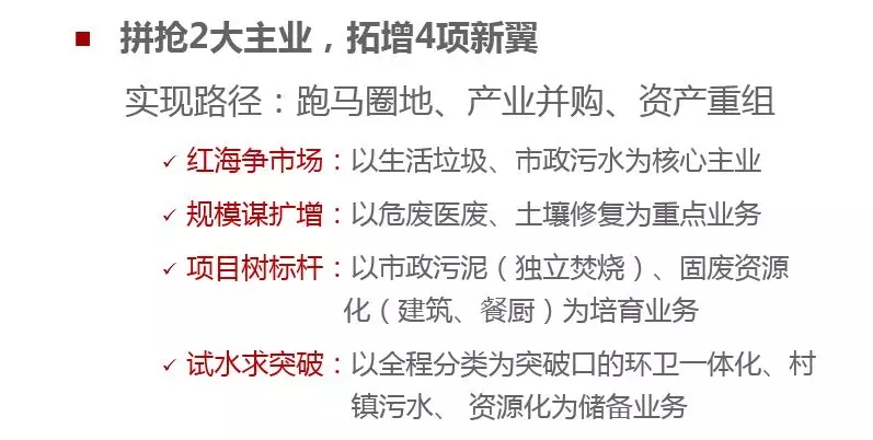 抓住環(huán)保行業(yè)持續(xù)增長的趨勢和新興業(yè)務(wù)爆發(fā)式增長的契機,繼續(xù)以“2+4”業(yè)務(wù)為重點,通過實施主動擴張戰(zhàn)略,快速提升市場規(guī)模,確保三年發(fā)展成為“3+3”并力爭向“4+2”業(yè)務(wù)格局轉(zhuǎn)型,并探索業(yè)務(wù)的延伸。