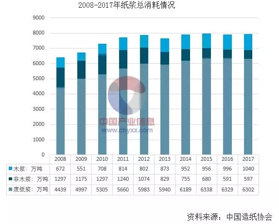 2017年全國紙漿消耗總量10051萬噸,較上年增長(zhǎng)2.59%。木漿3152萬噸,占紙漿消耗總量31%,其中進(jìn)口木漿占21%、國產(chǎn)木漿占10%;廢紙漿6302萬噸,占紙漿消耗總量63%,其中用進(jìn)口廢紙制漿占21%、用國產(chǎn)廢紙制漿占42%;非木漿597萬噸,占紙漿消耗總量6%。