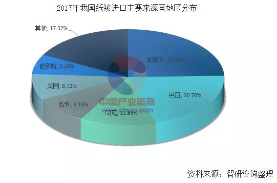 我國進(jìn)口紙漿來源國較為集中。2017年我國從30多個(gè)國家和地區(qū)進(jìn)口紙漿,前十大進(jìn)口國合計(jì)占比在90%左右。其中加拿大為最大進(jìn)口國,并維持高速增長(zhǎng)態(tài)勢(shì),巴西、印尼也同樣增速明顯,抵消了美國、芬蘭等國的進(jìn)口量下降,整體進(jìn)口量維持上漲。