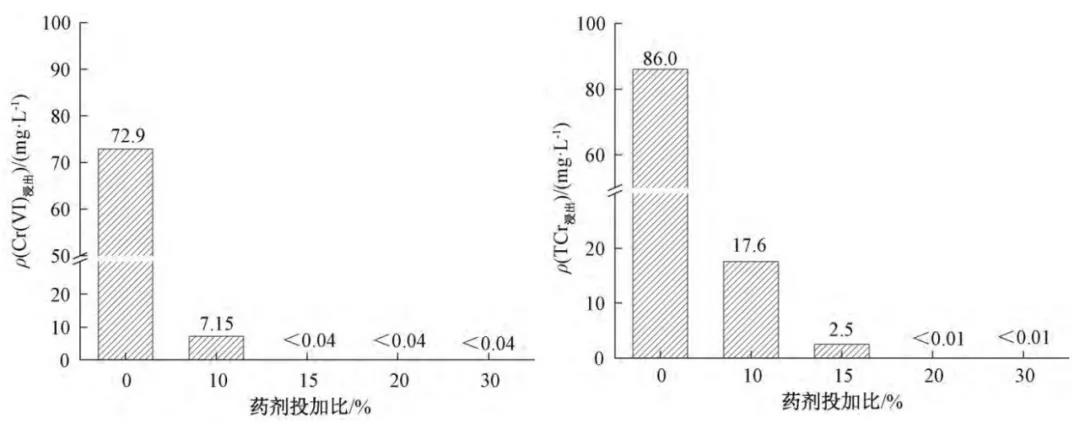 小試試驗設計取場地污染土壤,測得Cr(Ⅵ) 濃度為3156.7mg/kg,Cr(Ⅵ) 浸出濃度為72.9mg/L,總鉻浸出濃度為86.0mg /L, pH=10.2。自然風干后過 5 mm 不銹鋼篩,測定篩下產(chǎn)品含水率,干燥保存待用。取100g上述污染土壤置于聚丙烯罐中,分別按土壤質(zhì)量的0%、10%、15%、20%、30%添加 29%的多硫化鈣水劑,補充蒸餾水,使土壤含水率為其飽和含水率的90% 。攪拌均勻,密封反應,在反應的第7天取樣送檢,分別測定Cr(Ⅵ) 濃度、Cr(Ⅵ) 浸出濃度和總鉻浸出濃度。