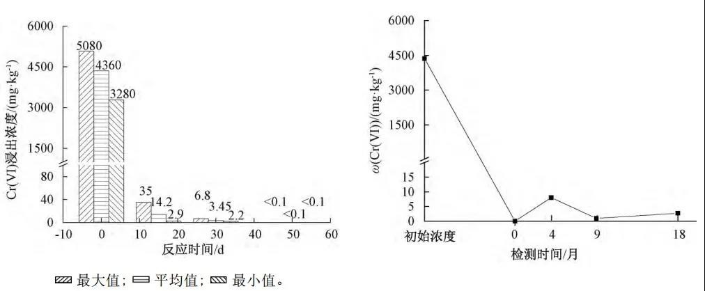 中試測試中,Cr(Ⅵ)最高濃度達5080mg/kg,理論藥劑投加比為10.1%,實際投加比為12%。反應15d后,Cr(Ⅵ)還原率達99.9%以上,50d后,Cr(Ⅵ)無檢出,還原率達到100%,實際應用效果良好,可應用于大規(guī)模生產(chǎn)。