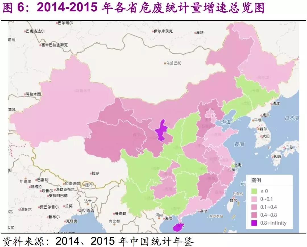 2016年危廢產(chǎn)生統(tǒng)計(jì)量增速較快、覆蓋越來(lái)越全面。2015-2016年,全國(guó)危廢產(chǎn)量由3976.11萬(wàn)噸上升至5347.3萬(wàn)噸,增速達(dá)35%。高增速一方面包含各行業(yè)產(chǎn)廢自然增速,另一方面也涵蓋了環(huán)保壓力下先前統(tǒng)計(jì)缺失的補(bǔ)足。