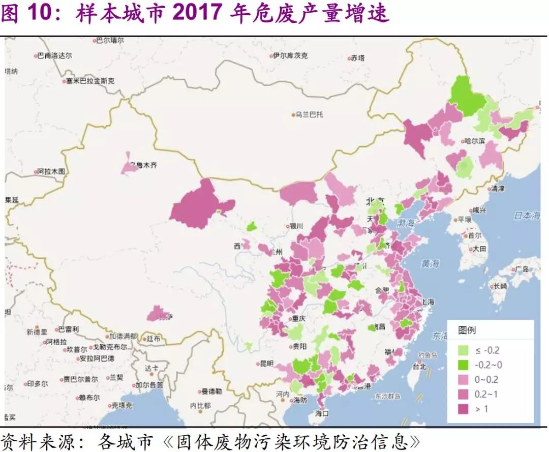 共生性體現(xiàn)在:危廢主要來(lái)源于工業(yè)生產(chǎn)過(guò)程,且治理需求反映了區(qū)域環(huán)保壓力的變化。通過(guò)對(duì)全國(guó)31省342個(gè)城市危廢信息的統(tǒng)計(jì),我們發(fā)現(xiàn)整體產(chǎn)廢大市集中在京津冀-山東、長(zhǎng)三角、遼沈一帶、西南重工業(yè)區(qū)等地域。從樣本數(shù)據(jù)來(lái)看,2017年全國(guó)危廢整體產(chǎn)量平均增速為18%。