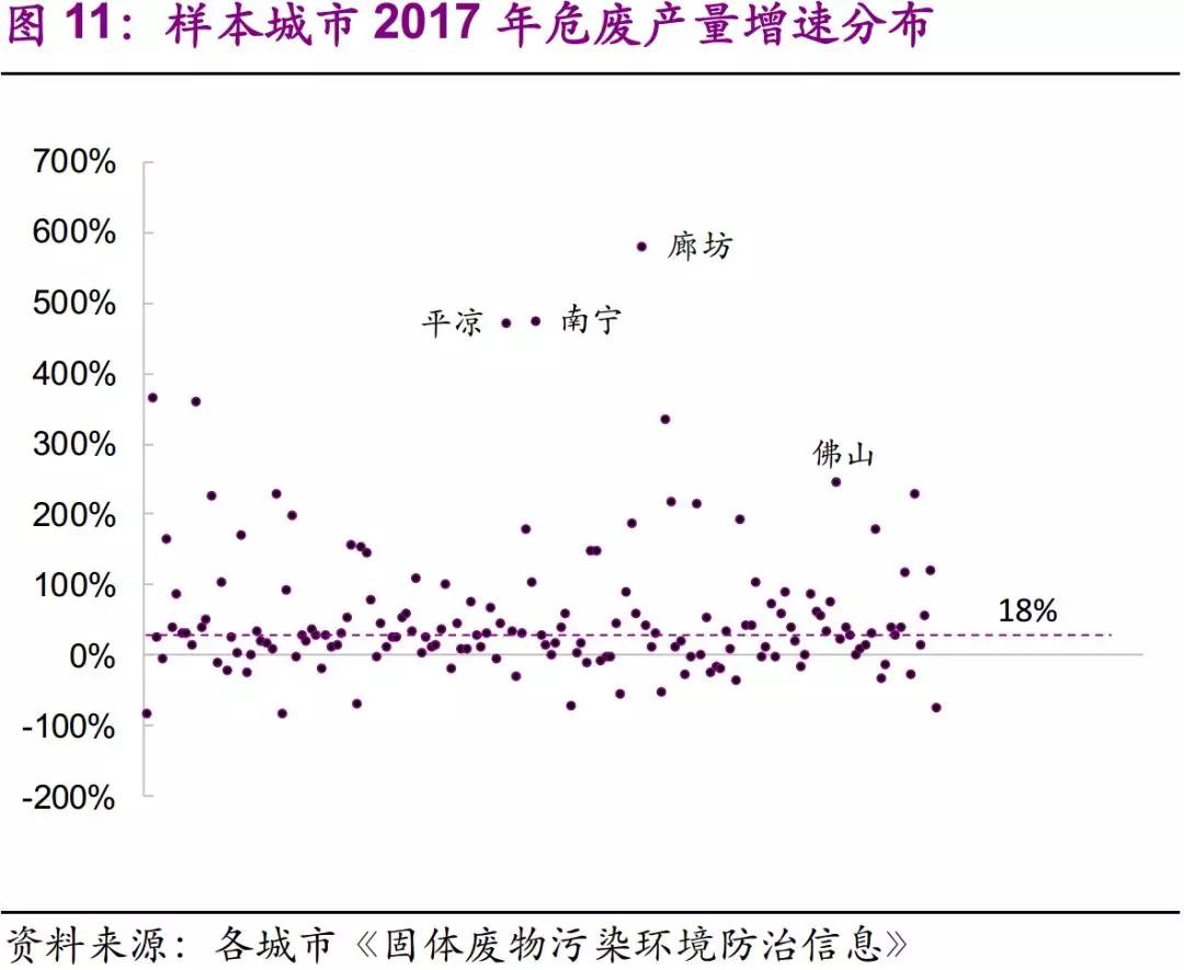 2017年各地危廢產(chǎn)生量統(tǒng)計(jì)增速正發(fā)生變化。2017年,京津冀地區(qū)、東北地區(qū)、西南地區(qū)城市危廢產(chǎn)量增速為負(fù),可能與京津冀地區(qū)大氣治理限產(chǎn)及產(chǎn)業(yè)遷移、東北地區(qū)經(jīng)濟(jì)衰退、西南地區(qū)重工業(yè)產(chǎn)業(yè)升級(jí)有關(guān)。沿海地區(qū)城市則延續(xù)高增長(zhǎng),也體現(xiàn)了當(dāng)?shù)氐沫h(huán)保壓力下產(chǎn)廢統(tǒng)計(jì)覆蓋增加。從樣本城市數(shù)據(jù)來(lái)看,2017年全國(guó)危廢產(chǎn)量平均增速為18%。