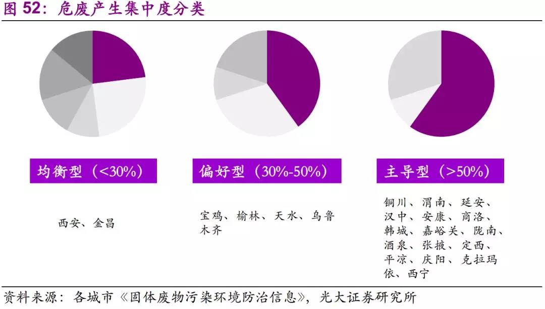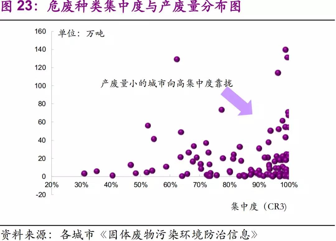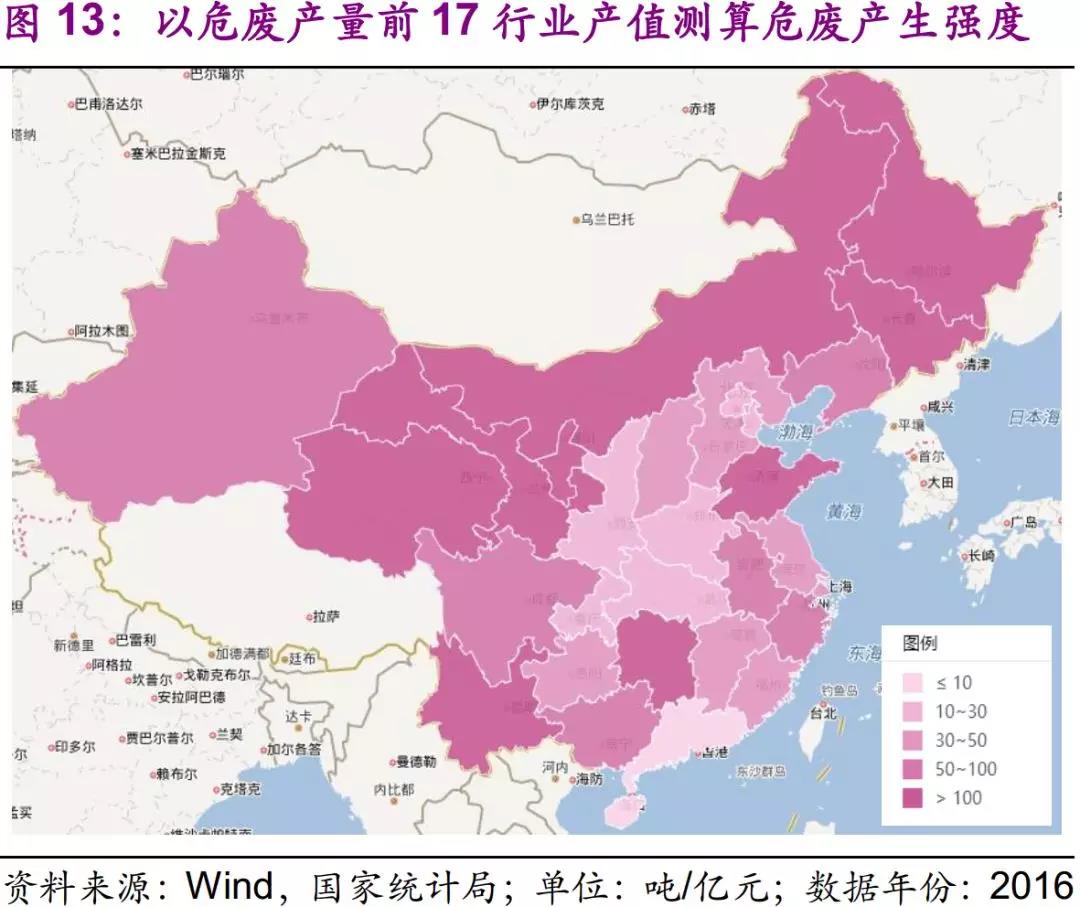集中度上看,不管是危廢種類(lèi)還是產(chǎn)廢企業(yè),西部、東北地區(qū)明顯大于東部沿海。
