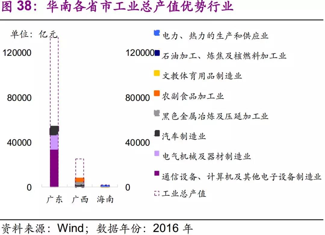 從全行業(yè)來(lái)看,廣東、廣西、海南優(yōu)勢(shì)產(chǎn)業(yè)分別為通信設(shè)備、計(jì)算機(jī)及其他電子設(shè)備制造業(yè)、汽車(chē)制造業(yè)和文教體育用品制造業(yè)。
