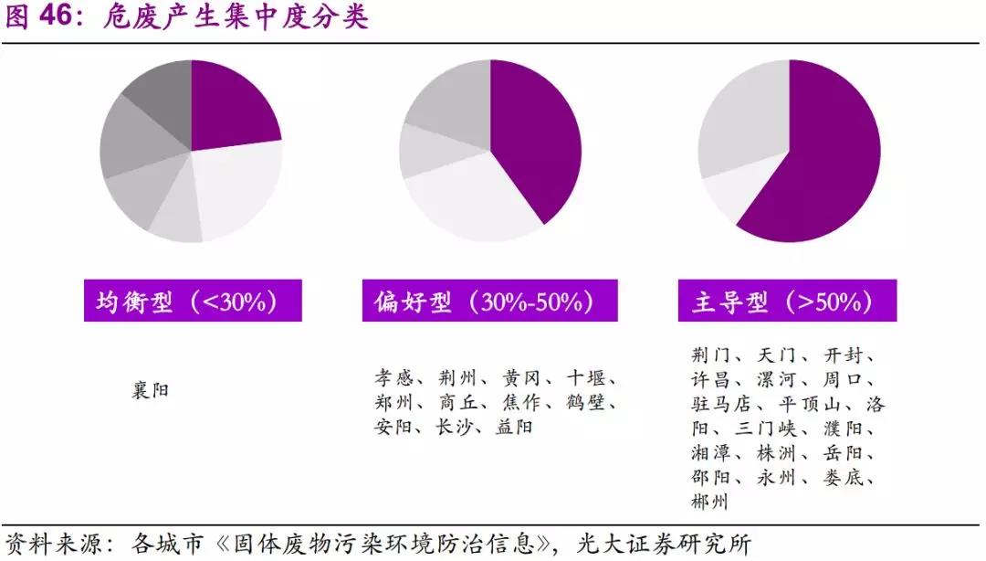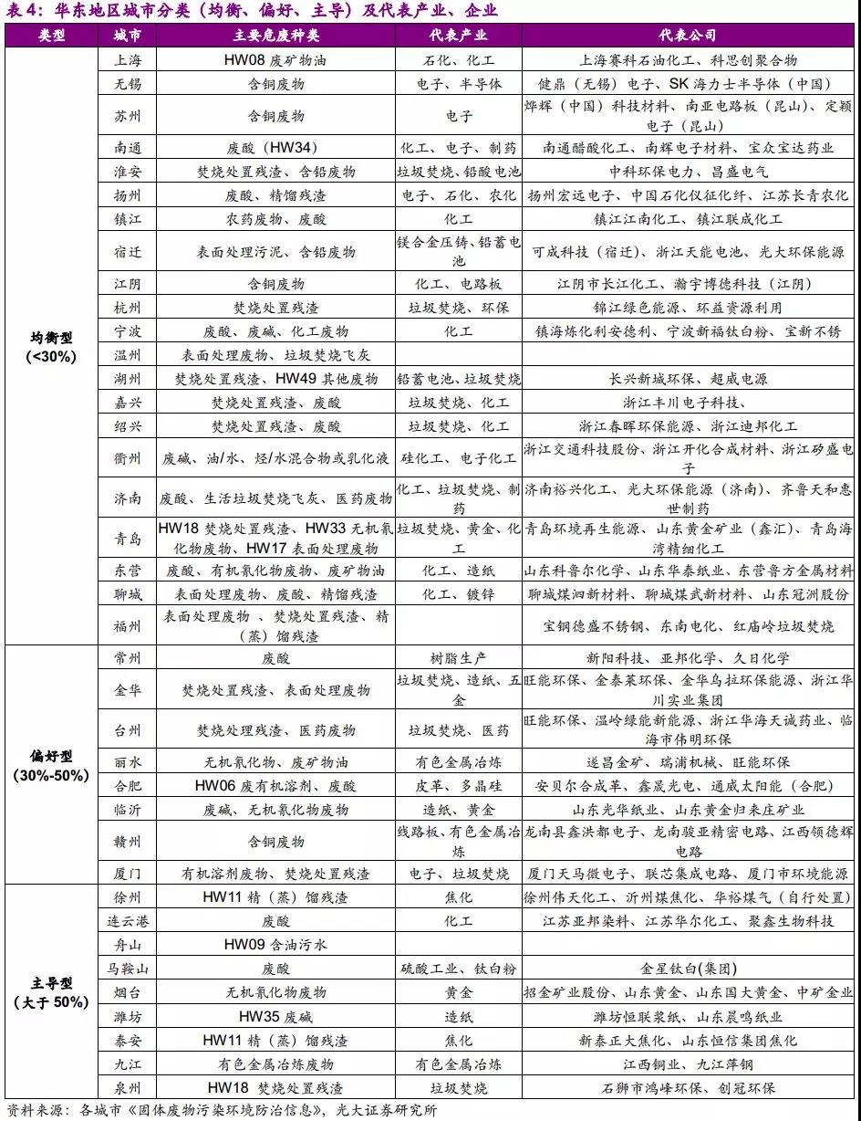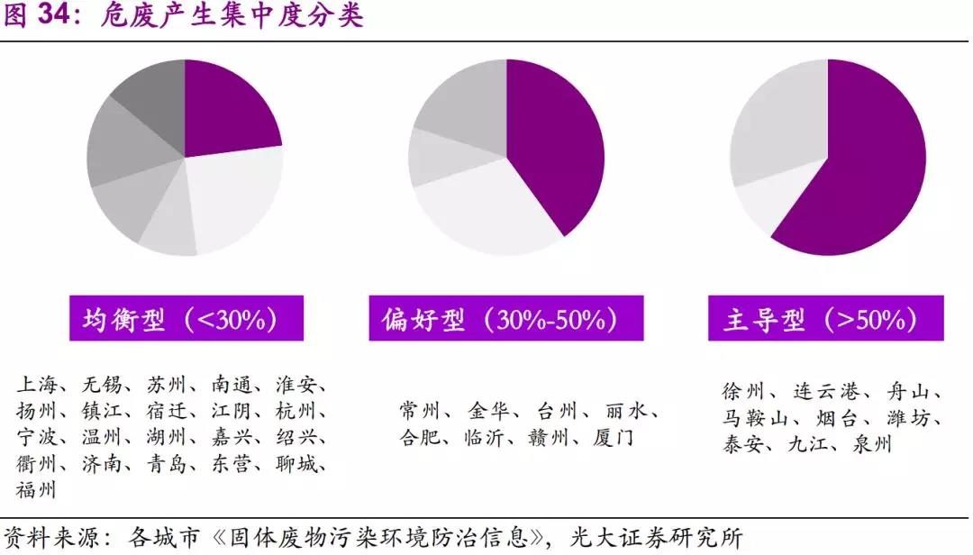 從2017年各市危廢增速來(lái)看,東部沿海地區(qū)延續(xù)高景氣度。從危廢種類(lèi)和產(chǎn)廢企業(yè)集中度來(lái)看,東部地區(qū)種類(lèi)更復(fù)雜,處理工藝要求更高。從城市分類(lèi)來(lái)看,均衡型城市處置需求最為復(fù)雜。