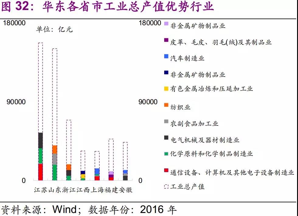 從全行業(yè)來(lái)看,江蘇、福建優(yōu)勢(shì)產(chǎn)業(yè)為通信設(shè)備、計(jì)算機(jī)及其他電子設(shè)備制造業(yè);浙江、安徽優(yōu)勢(shì)產(chǎn)業(yè)為電氣機(jī)械及器材制造業(yè);山東、江西、上海優(yōu)勢(shì)產(chǎn)業(yè)分別為化學(xué)原料和化學(xué)制品制造業(yè)、有色金屬冶煉和壓延加工業(yè)和汽車(chē)制造業(yè)。