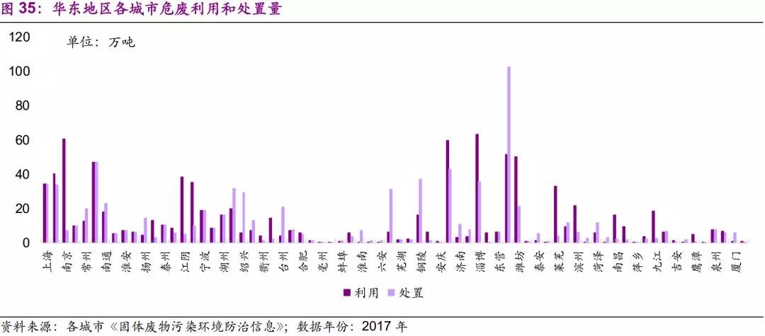 華東地區(qū)產(chǎn)廢大市集中于長(zhǎng)三角及山東地區(qū)。華東地區(qū)產(chǎn)業(yè)結(jié)構(gòu)較為完善,因此,各個(gè)城市對(duì)利用和處置產(chǎn)能的需求較為均衡。