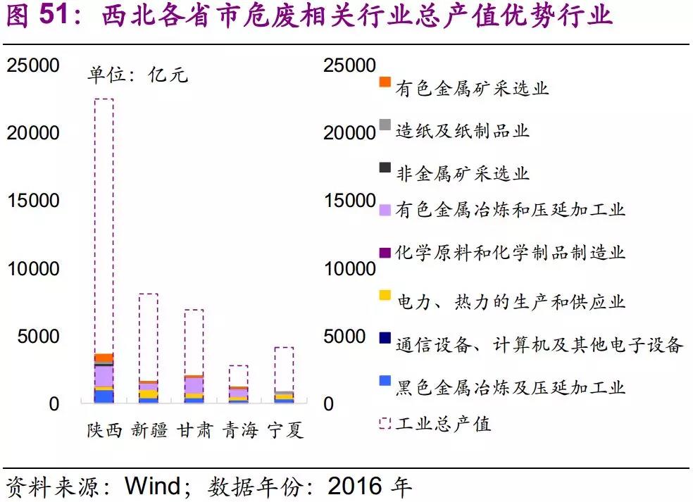 因此,我們認(rèn)為西北地區(qū)應(yīng)重點(diǎn)關(guān)注有色金屬冶煉和壓延加工業(yè)及黑色金屬冶煉及壓延加工業(yè)所產(chǎn)生的危廢,如有色金屬冶煉廢物、廢酸等。
