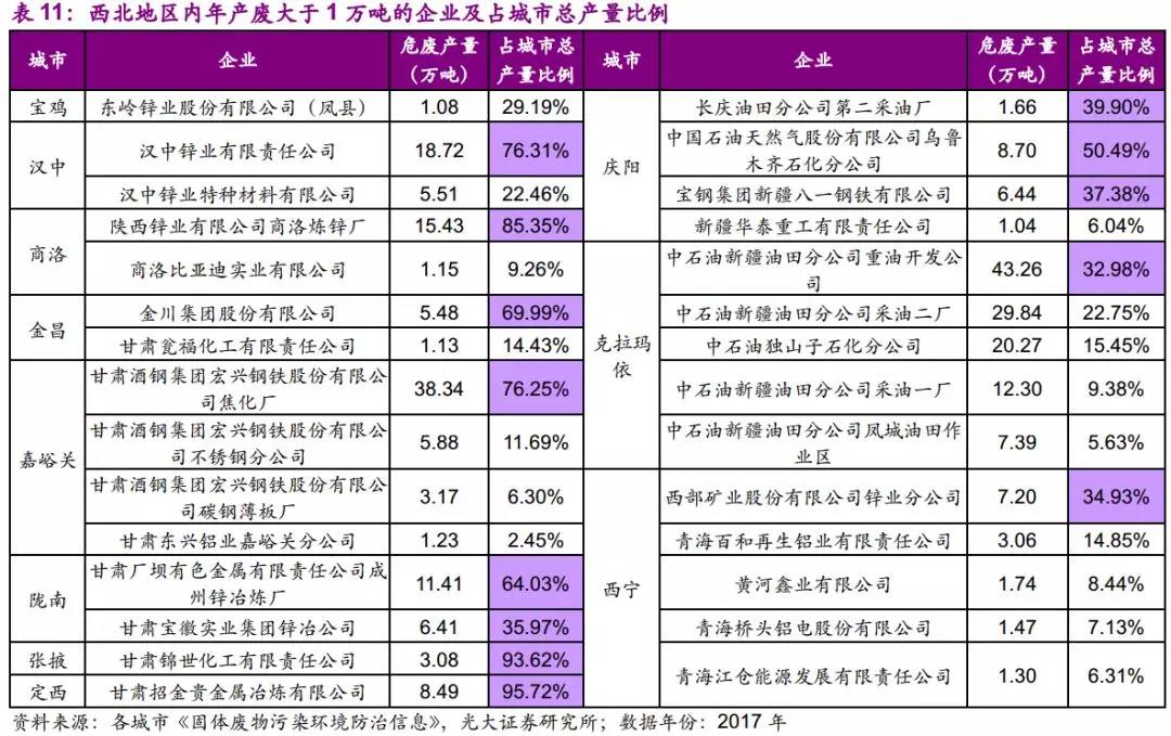 西北地區(qū)城市產(chǎn)業(yè)結(jié)構(gòu)較為單一,以主導(dǎo)型城市為主。主要產(chǎn)業(yè)有:1)石油和天然氣開(kāi)采,如延安、慶陽(yáng)、克拉瑪依;2)有色冶煉,如漢中、商洛、隴南、西寧;3)焦化及煤化工,如渭南、嘉峪關(guān)、韓城。產(chǎn)廢量占所在城市產(chǎn)廢量比例較大的企業(yè)有:漢中鋅業(yè)有限責(zé)任公司(76%)、商洛陜西鋅業(yè)有限公司商洛煉鋅廠(85%)、嘉峪關(guān)甘肅酒鋼集團(tuán)宏興鋼鐵股份有限公司焦化廠(76%)、定西甘肅招金貴金屬冶煉有限公司(96%)。