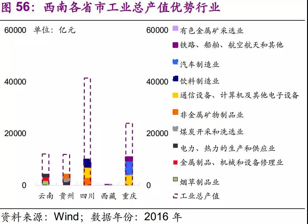 從全行業(yè)來(lái)看,四川、貴州、云南、重慶、西藏的優(yōu)勢(shì)產(chǎn)業(yè)分別為煤炭開(kāi)采和洗選業(yè)、煙草制品業(yè)、汽車(chē)制造業(yè)、金屬制品業(yè)。