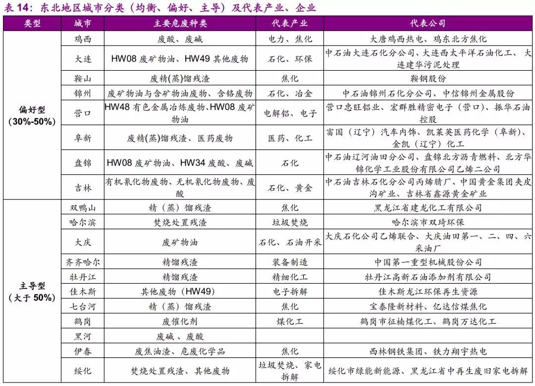 東北地區(qū)無(wú)均衡型城市,整體產(chǎn)業(yè)分為:1)石化、化工,如大連、阜新、盤(pán)錦、吉林、大慶等;2)煤、鋼產(chǎn)業(yè),如雞西、鞍山、雙鴨山、本溪、七臺(tái)河、伊春等。產(chǎn)廢量占所在城市產(chǎn)廢量比例較大的企業(yè)有:雙鴨山黑龍江省建龍化工有限公司(90%)、齊齊哈爾中國(guó)第一重型機(jī)械股份公司(72%)、鞍山鞍鋼股份有限公司(95%)、葫蘆島中冶葫蘆島有色金屬有限公司(68%)、吉林中石油吉林石化分公司丙烯腈廠(57%)等。