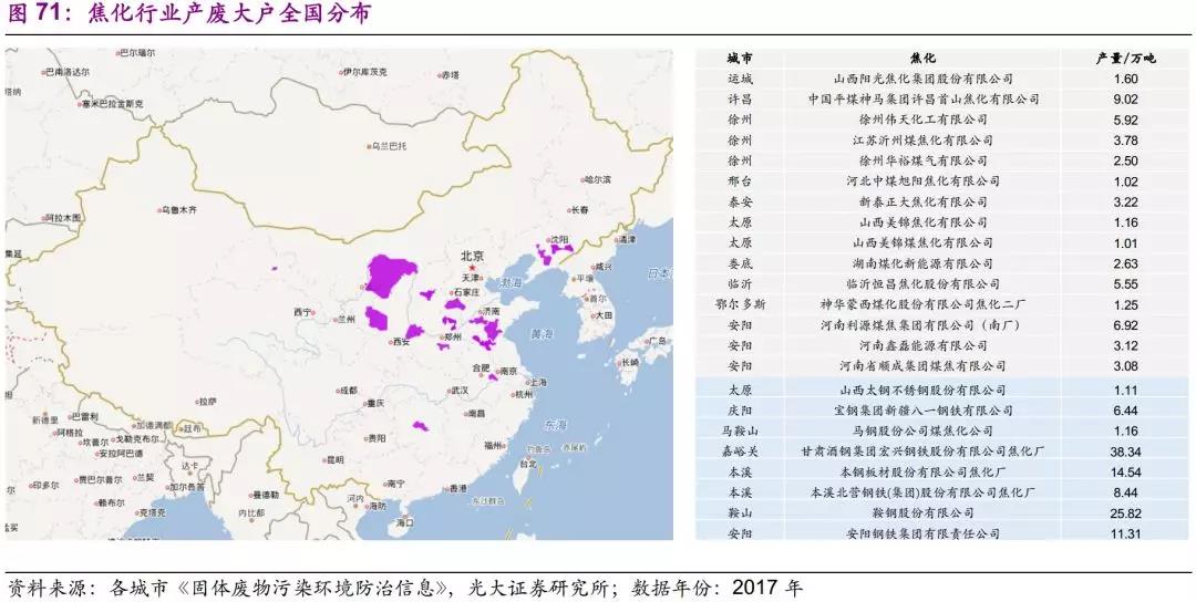 我國(guó)焦化行業(yè)產(chǎn)廢大戶(hù)主要分布于華北地區(qū),可分為兩類(lèi):一是獨(dú)立焦化企業(yè),主要分布于山東、山西等地,如中國(guó)平煤神馬集團(tuán)許昌首山焦化有限公司(9萬(wàn)噸)、河北中煤旭陽(yáng)焦化有限公司(1萬(wàn)噸)等;二是鋼鐵企業(yè)自建焦化廠,主要分布于本溪、鞍山、安陽(yáng)等地,如本鋼板材股份有限公司焦化廠(15萬(wàn)噸)、鞍鋼股份有限公司(26萬(wàn)噸)、安陽(yáng)鋼鐵集團(tuán)有限責(zé)任公司(11萬(wàn)噸)等。整體來(lái)看,鋼鐵企業(yè)自建焦化廠規(guī)模大于獨(dú)立焦化廠。