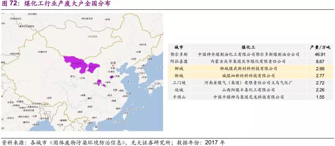 煤化工行業(yè)主要分布于內(nèi)蒙古、山東、河南等地。總體來(lái)看,行業(yè)分布較為集中,且規(guī)模較小。除中國(guó)神華煤制油化工有限公司鄂爾多斯煤制油分公司(47萬(wàn)噸)以外,其余企業(yè)年危廢產(chǎn)量均在10萬(wàn)噸以下。