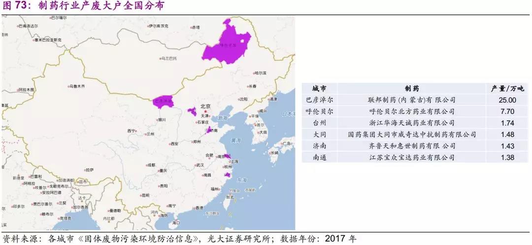 制藥行業(yè)普遍產(chǎn)廢量較小,進(jìn)入城市發(fā)布名單(前10名或前5名)的企業(yè)較少。納入統(tǒng)計(jì)的企業(yè)中,除內(nèi)蒙古聯(lián)邦制藥(內(nèi)蒙古)有限公司(25萬(wàn)噸)、呼倫貝爾北方藥業(yè)有限公司(7.7萬(wàn)噸)以外,其余企業(yè)年危廢產(chǎn)量均在1萬(wàn)噸左右。