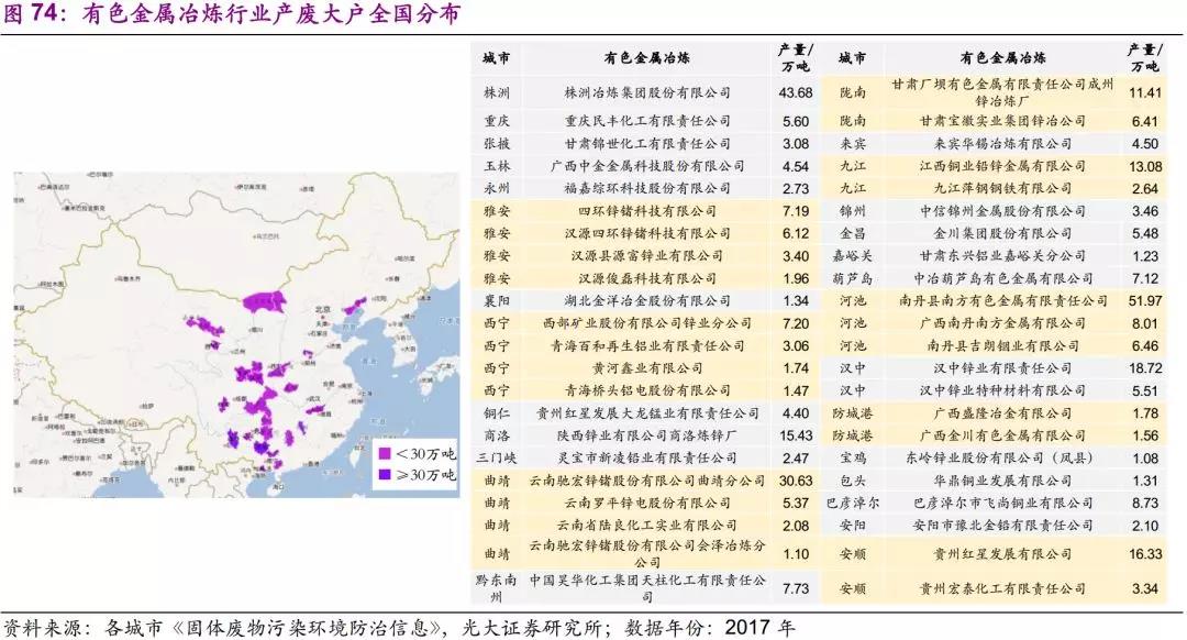 有色金屬冶煉大戶(hù)主要分布于西部地區(qū)。從湖南、貴州、廣西、云南、四川到陜西、甘肅、內(nèi)蒙古均有廣泛分布。其中產(chǎn)廢量較大的企業(yè)有株洲冶煉集團(tuán)股份有限公司(44萬(wàn)噸)、陜西鋅業(yè)有限公司商洛煉鋅廠(15萬(wàn)噸)、云南馳宏鋅鍺股份有限公司曲靖分公司(31萬(wàn)噸)、南丹縣南方有色金屬有限責(zé)任公司(52萬(wàn)噸)、漢中鋅業(yè)有限責(zé)任公司(19萬(wàn)噸)、貴州紅星發(fā)展有限公司(16萬(wàn)噸)。在雅安、安順、銅仁、曲靖等城市,有色金屬冶煉行業(yè)占據(jù)主導(dǎo)地位。