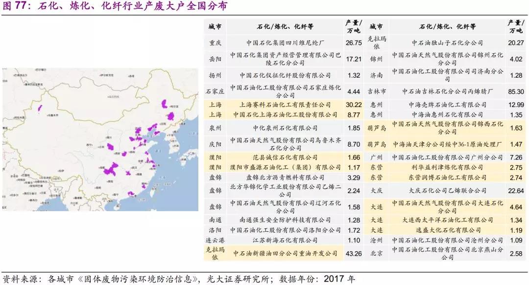 煉化企業(yè)主要分布于東北、山東、江蘇、川渝等地,基本上是中石油、中石化分公司。產(chǎn)廢量較大的企業(yè)有中國(guó)石化集團(tuán)四川維尼綸廠(27萬(wàn)噸)、上海賽科石油化工有限責(zé)任公司(30萬(wàn)噸)、中石油新疆油田分公司重油開(kāi)發(fā)公司(43萬(wàn)噸)、中石油吉林石化分公司丙烯腈廠(85萬(wàn)噸)。