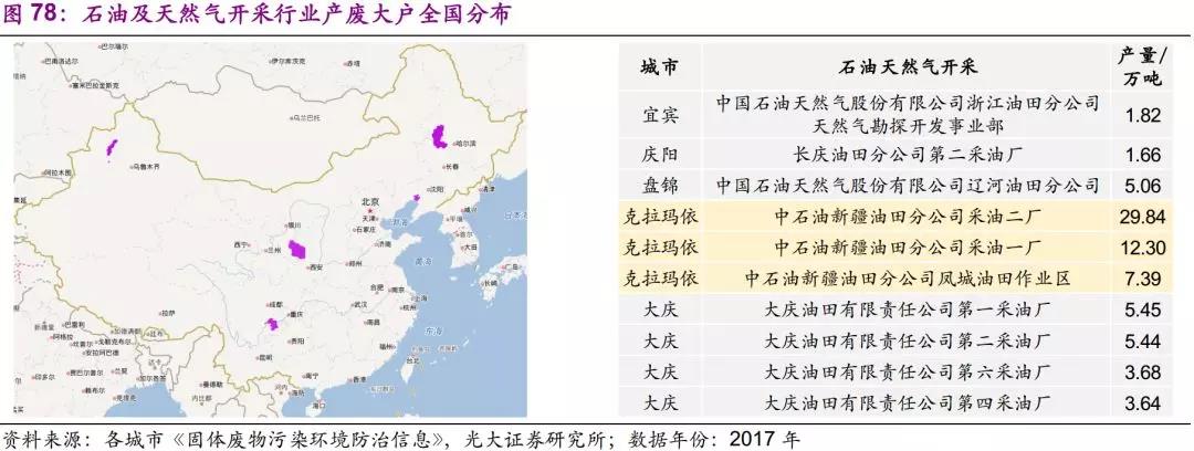 石油及天然氣開(kāi)采行業(yè)主要分布于我國(guó)幾大油田,如長(zhǎng)慶油田、大慶油田、克拉瑪依油田、遼河油田等。另外,隨著頁(yè)巖氣開(kāi)發(fā)逐步推進(jìn),川渝地區(qū)也將成為成為油田危廢的重要產(chǎn)地,2017年宜賓市中石油天然氣勘探開(kāi)發(fā)事業(yè)部產(chǎn)生危廢1.8萬(wàn)噸。而克拉瑪依中石油新疆油田第一、二采油廠及鳳城油田作業(yè)區(qū)共產(chǎn)生危廢近50萬(wàn)噸,遠(yuǎn)超其他油田產(chǎn)量。
