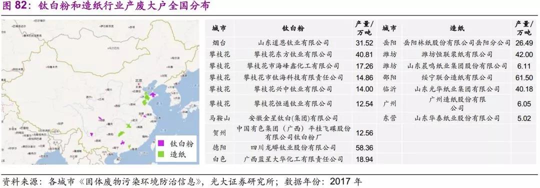 鈦白粉和造紙?jiān)旒埿袠I(yè)分布較為集中。其中攀枝花作為鈦白粉產(chǎn)業(yè)集中地,每年僅廢酸產(chǎn)量就達(dá)120萬(wàn)噸,2017年產(chǎn)廢量前5位均為鈦白粉生產(chǎn)企業(yè),分別是攀枝花東方鈦業(yè)有限公司(41萬(wàn)噸)、攀枝花市海峰鑫化工有限公司(17萬(wàn)噸)、攀枝花市鈦??萍加邢挢?zé)任公司(15萬(wàn)噸)、攀枝花興中鈦業(yè)有限公司(14萬(wàn)噸)、攀枝花恒通鈦業(yè)有限公司(13萬(wàn)噸)。造紙企業(yè)產(chǎn)廢大戶(hù)則主要分布于山東、湖南兩省,主要有邵陽(yáng)綏寧聯(lián)合造紙有限公司(62)萬(wàn)噸、濰坊濰坊恒聯(lián)漿紙有限公司(42萬(wàn)噸)、臨沂山東光華紙業(yè)集團(tuán)有限公司(40萬(wàn)噸)等。