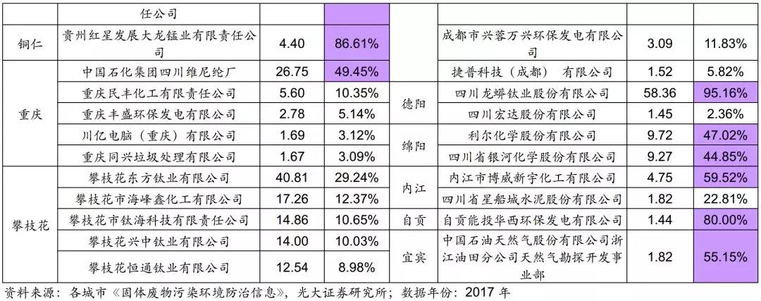 西南地區(qū)以主導(dǎo)型城市為主,多數(shù)城市產(chǎn)廢量較小,且種類(lèi)單一。主要產(chǎn)業(yè)有:1)有色金屬冶煉,如曲靖、銅仁、怒江、雅安、安順;2)鈦白粉產(chǎn)業(yè),如攀枝花、德陽(yáng)。產(chǎn)廢量占所在城市產(chǎn)廢量比例較大的企業(yè)有:曲靖云南馳宏鋅鍺股份有限公司曲靖分公司(60%)、安順貴州紅星發(fā)展有限公司(83%)、黔東南州中國(guó)昊華化工集團(tuán)天柱化工有限責(zé)任公司(98%)、銅仁貴州紅星發(fā)展大龍錳業(yè)有限責(zé)任公司(87%)、德陽(yáng)四川龍蟒鈦業(yè)股份有限公司(95%)。