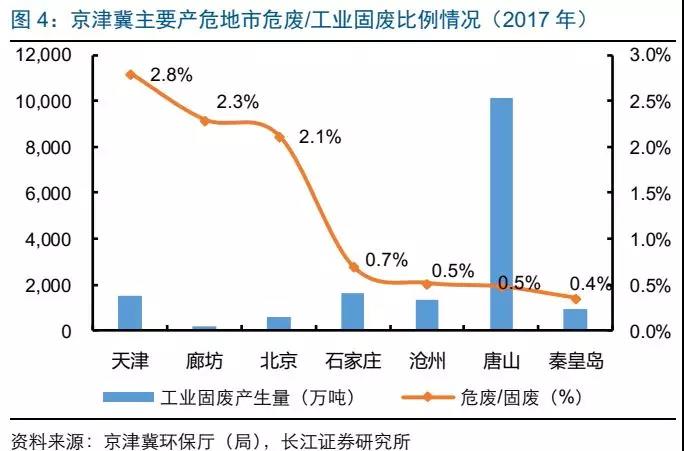 根據(jù)可獲得8市數(shù)據(jù),2017年京津冀8市危廢產(chǎn)量約129萬噸,同比降3%,唐山/天津合計(jì)產(chǎn)危占69.5%;其中,北京(-29%)、天津(-5%)、秦皇島(-8%)均出現(xiàn)下滑,可能與供給側(cè)改革導(dǎo)致產(chǎn)廢企業(yè)減少有關(guān)。河北鋼鐵(產(chǎn)生大量的廢礦物油(HW08)、廢酸(HW34)、含鋅廢物(HW23)),北京汽車制造(染料、涂料廢物(HW12)、表面處理廢物(HW17)為主),天津金屬制品(廢酸(HW34)為主)發(fā)達(dá),2017年京津冀危廢占固廢比例同比降0.1pct至0.7%,占比較低不排除偷排漏排情況嚴(yán)重,河北、天津爆出大面積廢酸深坑或與廢酸偷排有關(guān)。