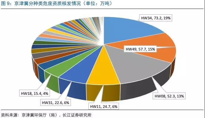 京津冀危廢種類中前5位的廢酸(HW34,73.2萬噸,占總資質(zhì)的19%)/其他廢物(HW49,57.7萬噸,占總資質(zhì)的15%)/廢礦物油(HW08,52.3萬噸,占總資質(zhì)的13%)/精餾殘?jiān)℉W11,24.7萬噸,占總資質(zhì)的6%)/含鉛廢物(HW31,22.6萬噸,占總資質(zhì)的6%),合計(jì)約占資質(zhì)總量的59%,危廢資質(zhì)種類集中度高。