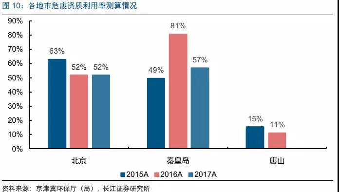 秦皇島市:2015-2017年資質(zhì)利用率為別是49%、81%、57%,拿證企業(yè)處置的危廢量分別是5.5、5.7、6.3萬噸,主要是徐山口危廢處理站(目前已被雅居樂收購),主要是無害處產(chǎn)能。