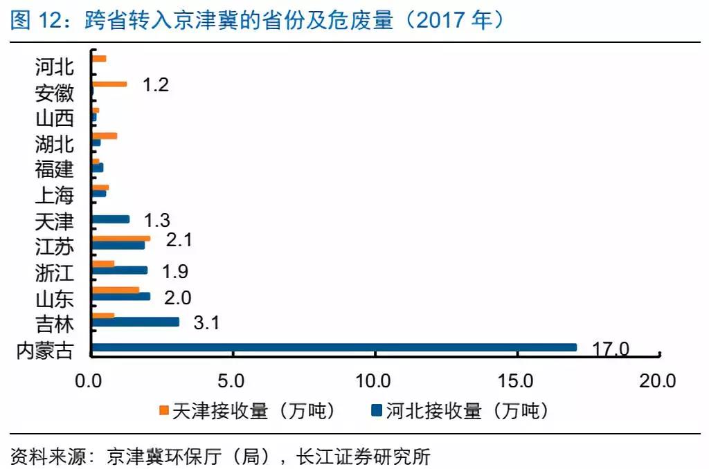 2017年跨省轉(zhuǎn)入危廢38.2萬噸,主要來自內(nèi)蒙古、江蘇、吉林,以精蒸餾殘?jiān)?、廢鉛酸蓄電池為主